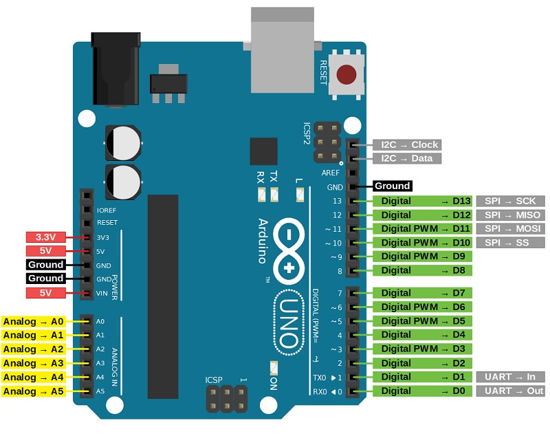 Sol üstteki kırmızı ve siyah işaretlenen pinler güç pinleridir. Kırmızı pinler yazdığı değer kadar voltaj beslemesi sağlar. Siyah etiketli ground ya da kısaca GND pinleri toprak hattıdır. Bir nevi pillerdeki (-) uç gibi düşünülebilir, ancak tam karşılamaz. GND, (-) uç olmaktan çok daha fazlasıdır. Hemen aşağısında Analog Pinler bulunur. Bunlar karta giren analog değerlerin alındığı pinlerdir. Örneğin Işık değeri. Değişken analog bir değere sahiptir. Işık sensörünüz varsa – ileride uygulaması olacak – bu pinlere takarak arduinun ışık değişimini izlemesini sağlayabilirsiniz. Analog pinler 0-1024 arasında değerler alabilir. üst veya alt değerleri alamaz. Sağ taraftaki yeşil pinler dijital pinlerdir. yalnızca 0 veya 1 değerinde giriş veya çıkışı kabul ederler. Bazı etiketlerde PWM yazar. PWM 0-256 arasında çıkış verebilen pinlerdir. Ancak bu analog çıkış veriyor demek değildir. Bunun sırrı PWM’de saklıdır. Bu konuya da yine geleceğiz. Ancak kafa karışıklığınızı gidermek adında analog gibi düşünebilirsiniz. UART-SPI-I2C ve diğer sayılmayan pinlere daha sonra değineceğiz. Şimdilik bunların haberleşme pinleri olduğunu bilebilirsiniz. 0 ve 1. dijital pinler (D0-D1) haberleşme pinleri olduğundan buralardan dijital giriş veya çıkış işlemlerimizi yapmayız. Bunlarıda daha sonra haberleşme için kullanacağız.